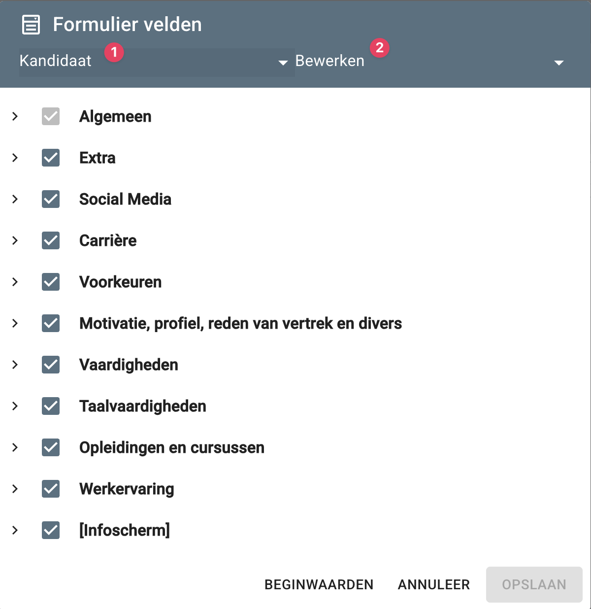Hier kun je bovenin de entiteit selecteren (1) en vervolgens het scherm (2) wat je wilt wijzigen.