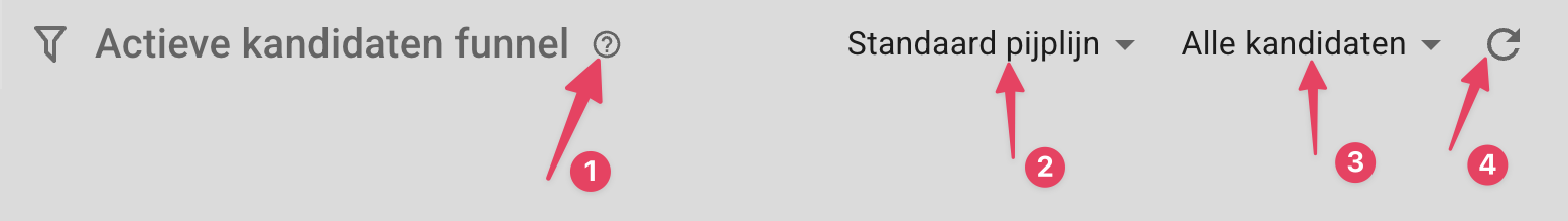 De kandidaten funnel toont een overzicht van actieve kandidaten over alle vacatures, met de optie om ook nieuw aangemaakte kandidaten weer te geven. Onder actieve kandidaten vallen: