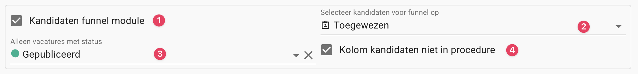 Activeer de kandidaten funnel via de optie “Kandidaten funnel module” (1). Vervolgens kun je de volgende instellingen configureren: